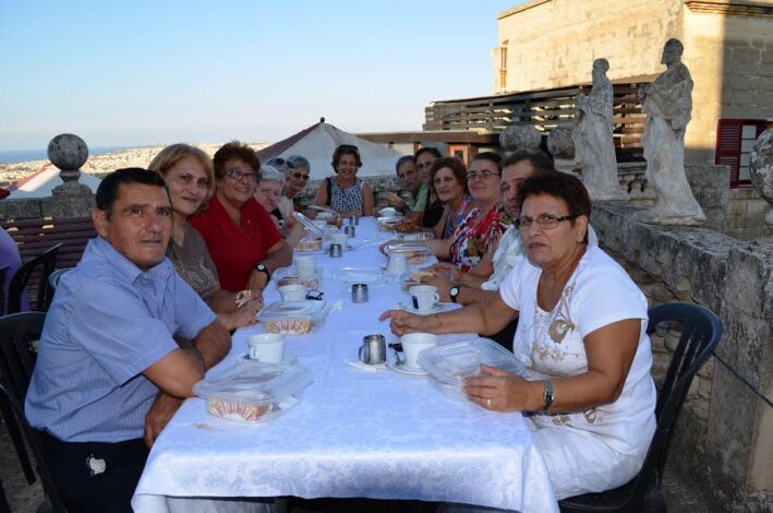The selected group of patients had a wonderful relaxing time, sitting at tables and being served by the dedicated Fontanella staff, meeting up in a warm and friendly atmosphere. A lot of catching up took place amongst giggles and laughter ! One delightful gentleman stole the afternoon show by relating old time stories to his happy surrounding friends. The Fontanella tea rooms, as always prepared a delicious array of food with teas and coffees being served all through the afternoon. The Lourdes Volunteers and malades enjoyed this reunion immensely, sitting in the beautiful rooftop terrace which overlooks the impressive landscapes which can be seen from the Mdina bastions. A big thank you goes to our devoted volunteers for coordinating this special and happy event and to the Sant Manduca Family whose kindness knows no bounds.