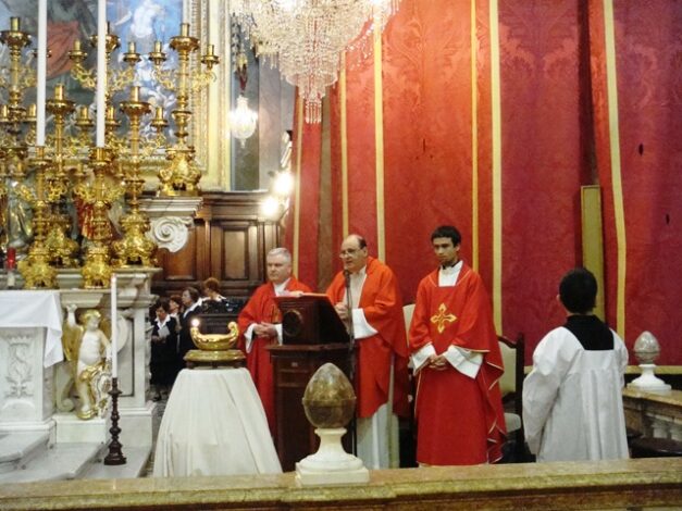 As in previous years, the votive lamp was carried by members of the Order from the Museum of Wignacourt to the nearby Church of St Paul where the Very Rev. Mgr John Azzopardi read a short history of the votive lamp.