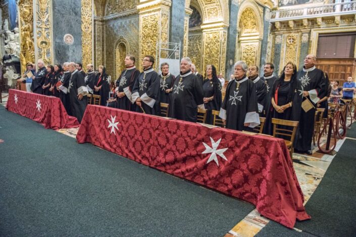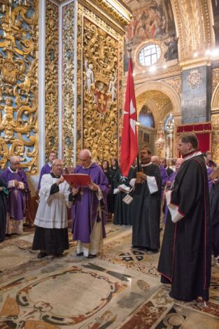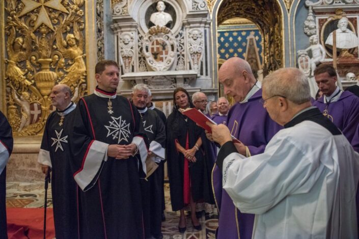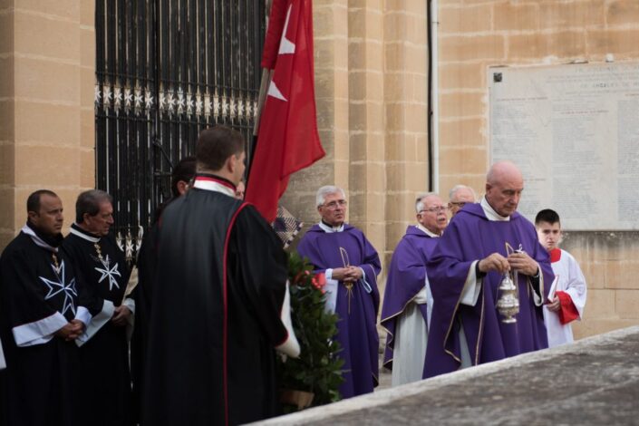 The procession moved back inside the Co-Cathedral to the sepulchral slab of one of the great heroes of the Great Siege, Fra’ Don Melchior de Robles which is situated in the Chapel of the Langue of Auvergne, where prayers were again offered for the repose of his soul, before then processing for a memorial prayer at the tomb of Grand Master Jean Parisot de Valette.