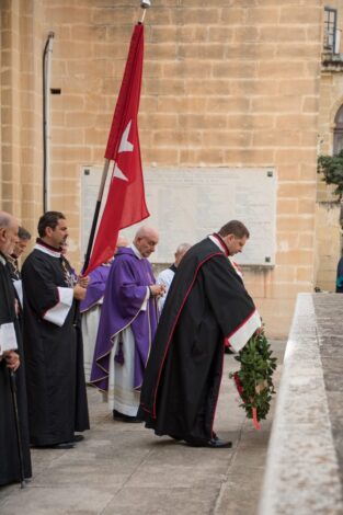 At the end of Mass, the members of the Order followed by the Reverend Clergy, processed to the the Great Siege Memorial Graveyard to the side of the church, where prayers of remembrance were offered for the repose of the souls of those Knights who had lost their lives in defence of Christianity, after which the President, Marchesino Daniel de Petri Testaferrata laid a wreath at the memorial.