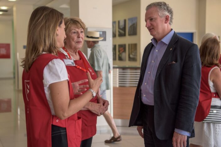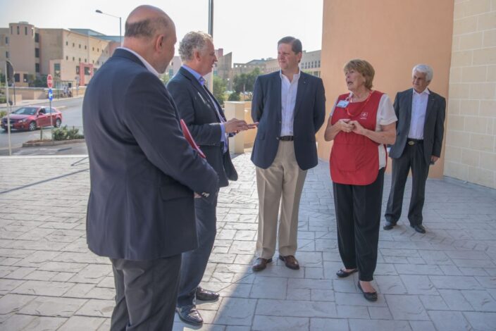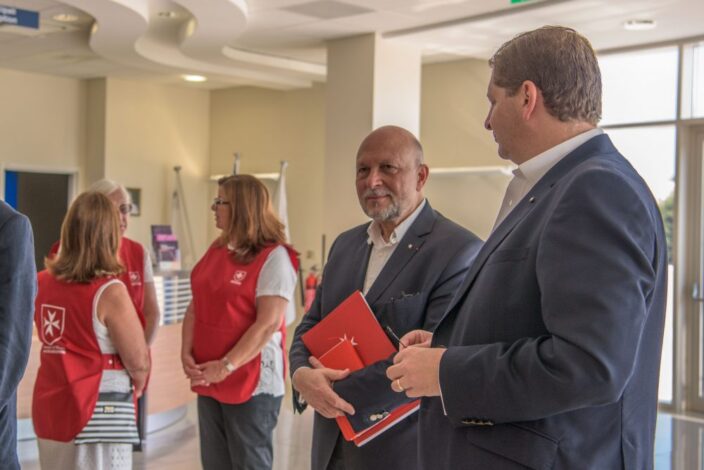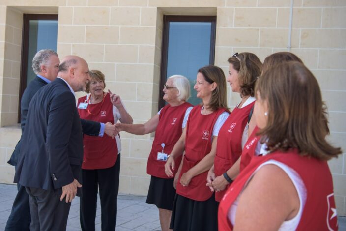 On Saturday 3 September Fra’ Jean-Luis and Fra’ Paul accompanied by the President and the Hospitaller visited the Association’s recently re-launched trolley service at Sir Anthony Mamo Oncology Centre, where they were greeted by Mr. SaviourcGalea on behalf of the Hospital and the Dowager Vivien Cassar de Sayn who introduced those volunteers who attended the event proudly sporting their brand new red tabards.
