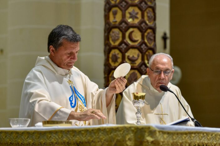 His Grace the Bishop of Gozo also blessed a basketful of special Our Lady of Ta’ Pinu wooden rosary beads placed in individual blue pouches which were presented by the Hospitaller and distributed by VOTO members to each one of Our Lords the Sick and the Elderly attending the pilgrimage.