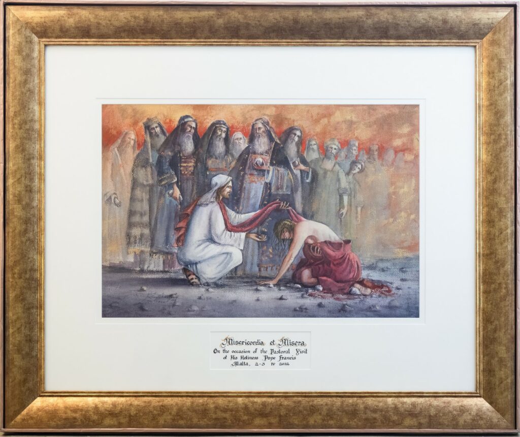 The Archbishop then presented the Pope with a painting by John Martin Borg called ‘Misericordia et Misera’ depicting the woman mentioned in the gospel. The painting shows the pharisees and scribes preparing to stone her, as Jesus Christ extends his arms towards the adulterous woman and offers her His own red cloak to cover her body – a simple, symbolic act that restores the woman’s lost dignity. With this gesture, Jesus invites her to partake in His divine nature.