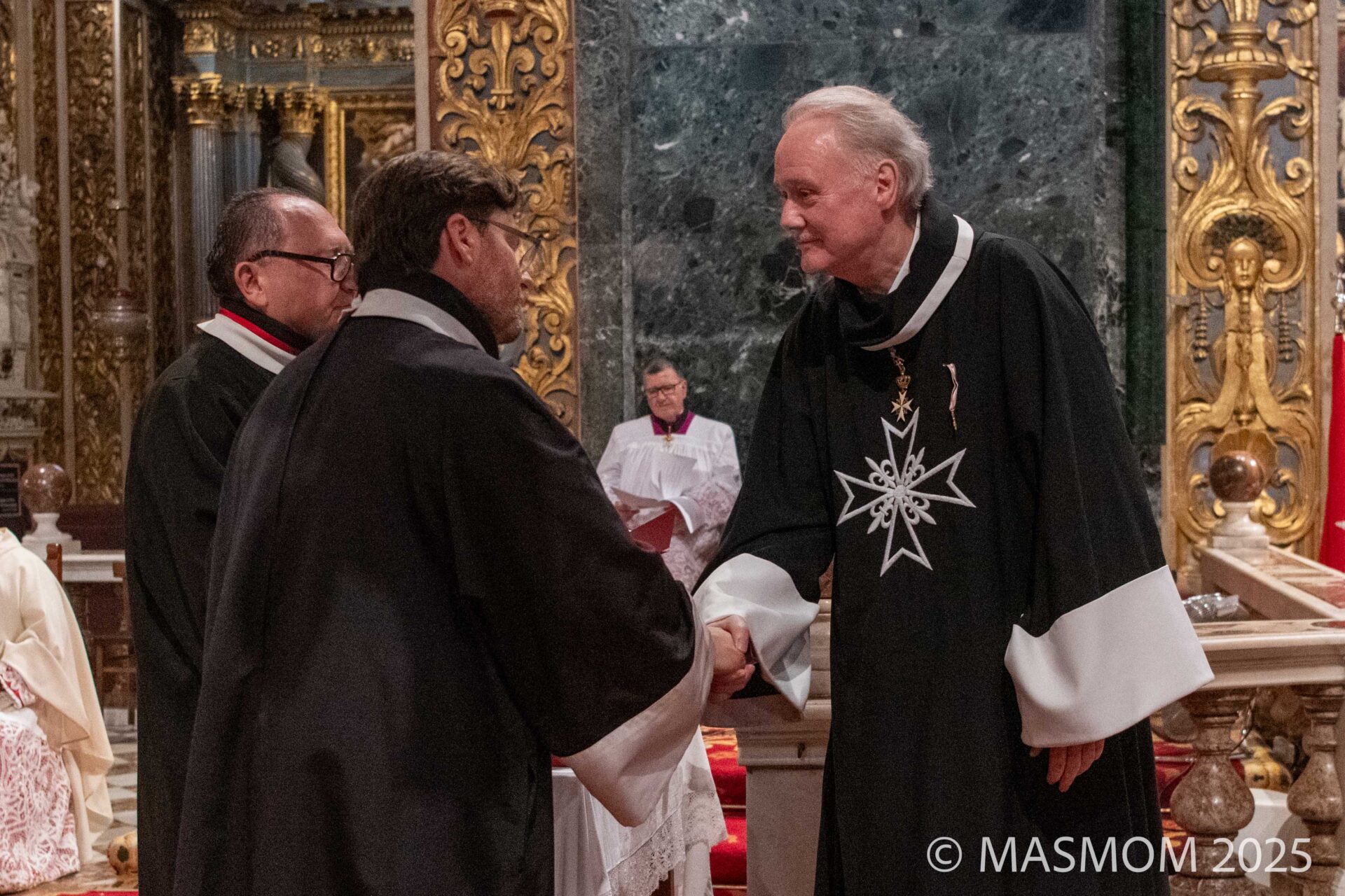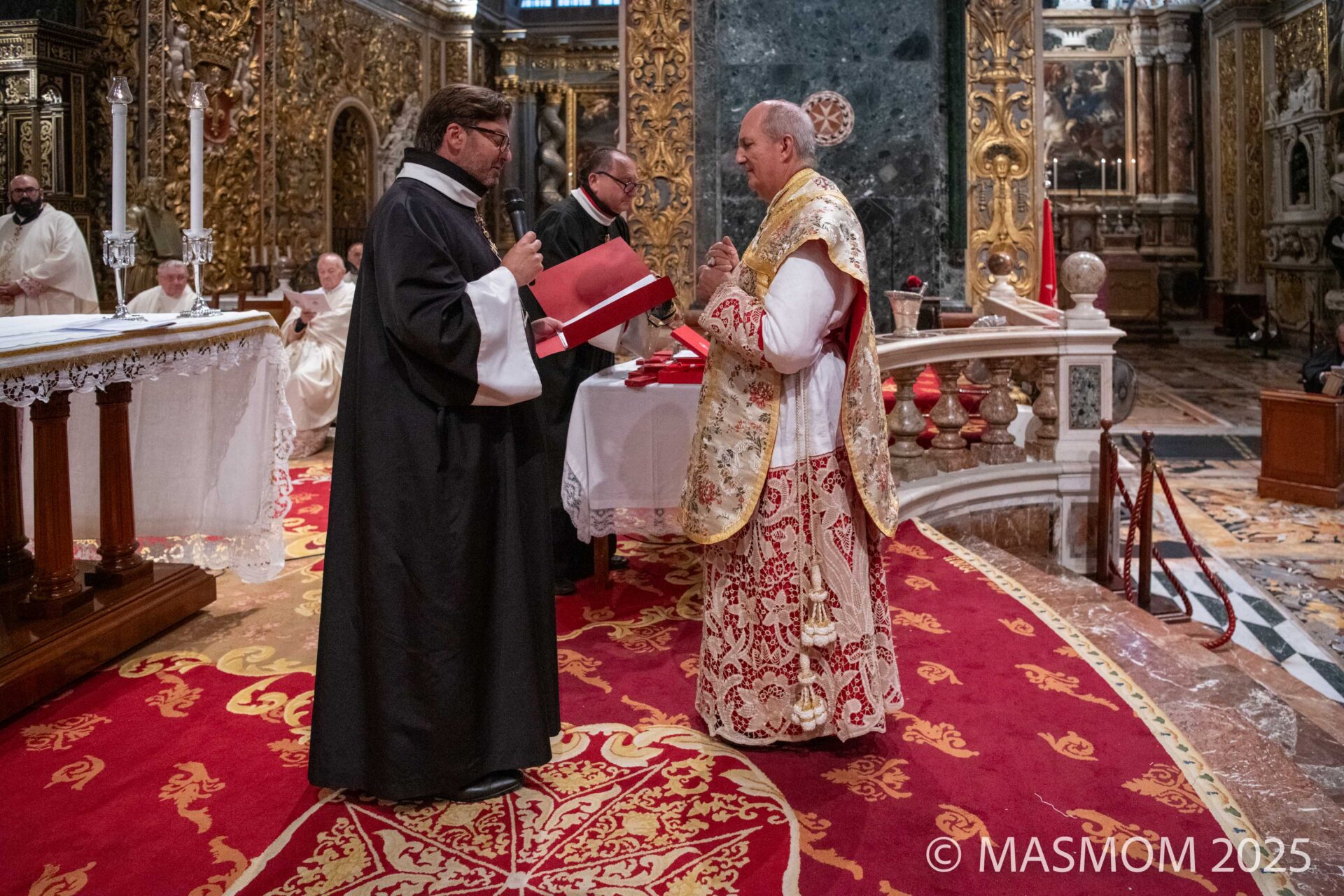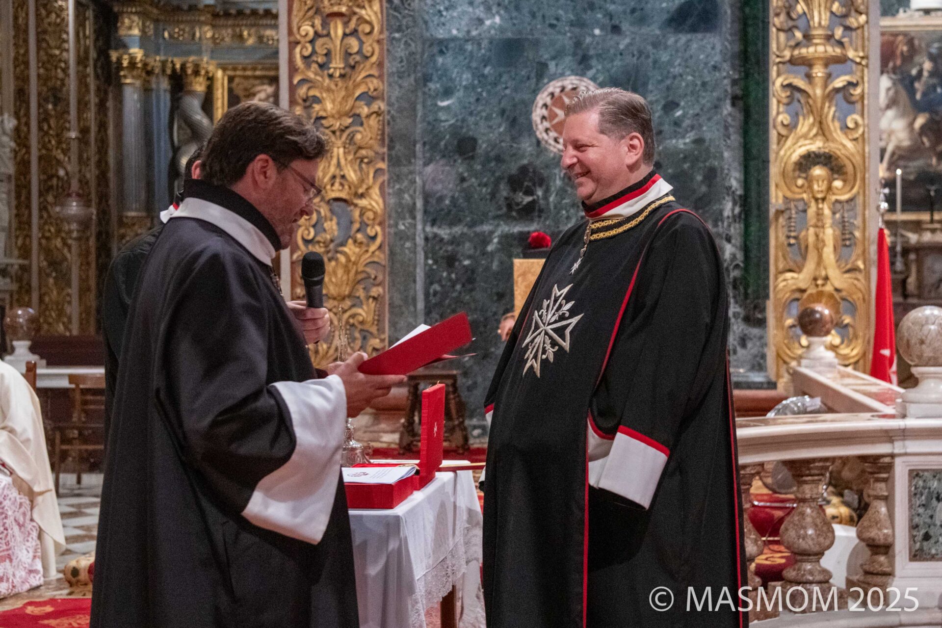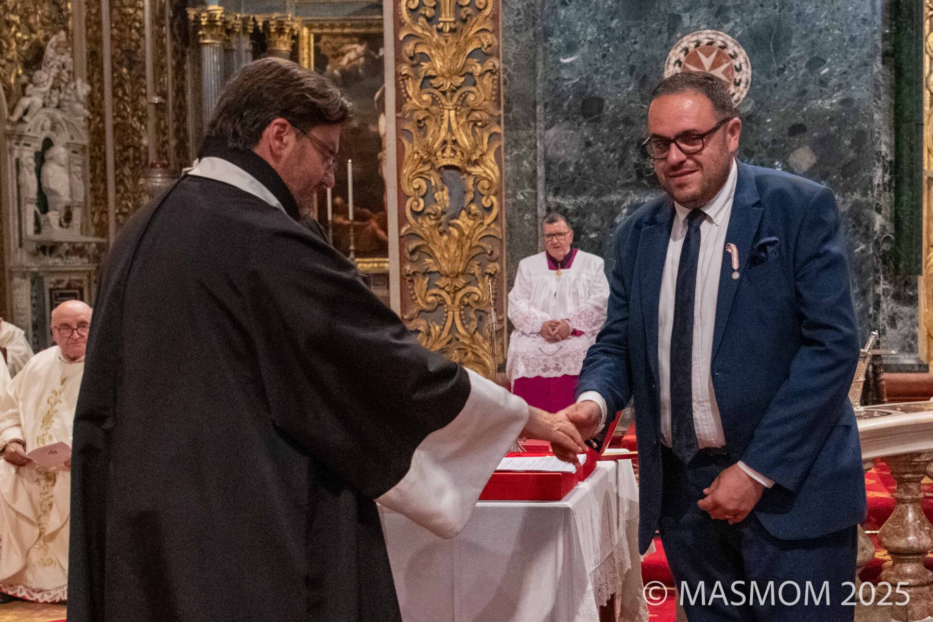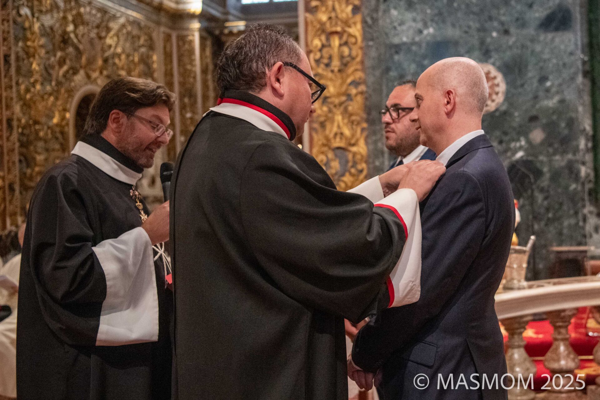 The Master of Ceremonies, Christopher Cassar Torregiani, then conducted Mr. Chris Galea to the Presbytery whereby the President, Dr Michael Grech, conferred on him the Grand Cross of Magistral Grace in Obedience. The Secretary General led the Reverend Monsignor Paul C Vella to the President who conferred on him the insignia as Conventual Chaplain Grand Cross ad honorem.